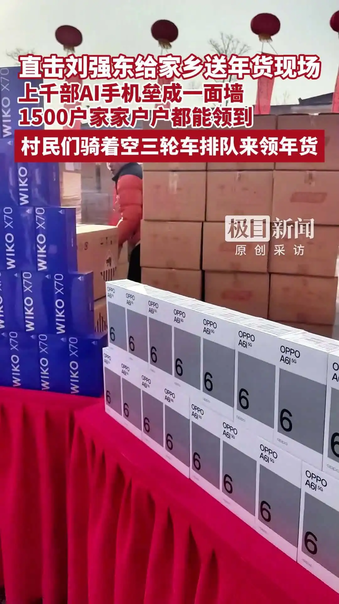 京东刘强东给老家“光明村”送超万件年货:大屏 AI 手机垒成墙,村民骑着三轮车排队领