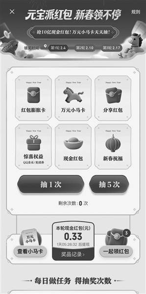 “今年手机里的AI助手都在搞新年红包活动,前两天正巧看到就顺手参与了一下。”腾讯元宝在2月1日0点正式上线春节活动,作为最先一批参与活动的用户,小张在两天不到的时间里已经领到了二十几元的待提现红包,“我还加入了一个群,在群里大家可以互相分享,完成每日红包任务。”在小张的印象里,以往的赛博新年自己都是在支付宝集福开红包,早已没有新鲜感。
